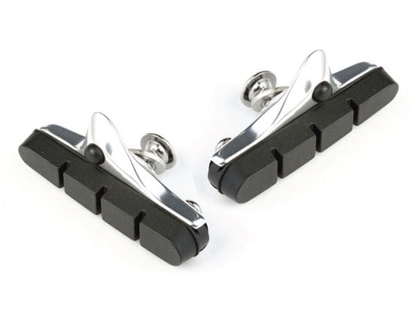 Wysokiej jakości klocki do hamulców szosowych i innych typu „U”. Aluminiowy korpus usztywnia klocek i zwiększa siłę i precyzję działania. Wkładki wykonane z czarnej, uniwersalnej mieszanki gumy. Charakteryzują się optymalnym stosunkiem trwałości do siły hamowania. Odprowadzające wodę nacięcia wydłużające żywotność klocków i obręczy. Przykręcane do szczęki hamulca za pomocą śruby imbusowej.