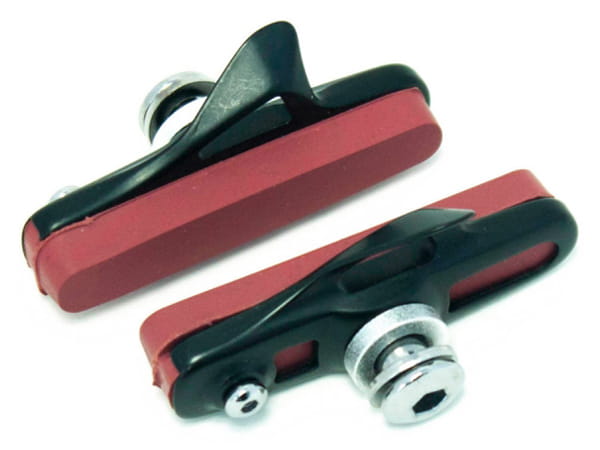 Wysokiej jakości klocki do hamulców szosowych. Wykonane z czerwonej mieszanki gumy do obręczy karbonowych. Lekki, aluminiowy korpus usztywnia klocek i zwiększa siłę i precyzję działania. Charakteryzują się bardzo dużą siłą hamowania. Przeznaczone na każde warunki pogodowe. Kompatybilne z hamulcami Shimano. Możliwość wymiany wkładek hamulcowych.
