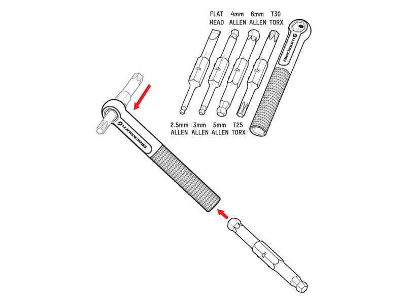 Narzędzia: W zestawie bity TORX T25, T30, Imbus 2.5, 3, 4, 5, 6mm , Śrubokręt płaski