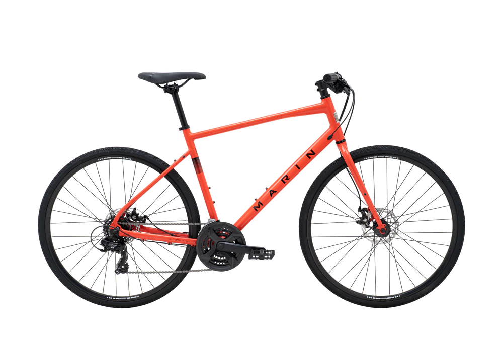 The Fairfax 1 is the most affordable in the collection. Named “Best Hybrid” many years running by Wirecutter it’s built around a lightweight Series 1 aluminum frame and a sturdy CrMo fork and comes with a 3x7-speed Shimano drivetrain, Tektro mechanical disc brakes and plenty of reliable Marin components.