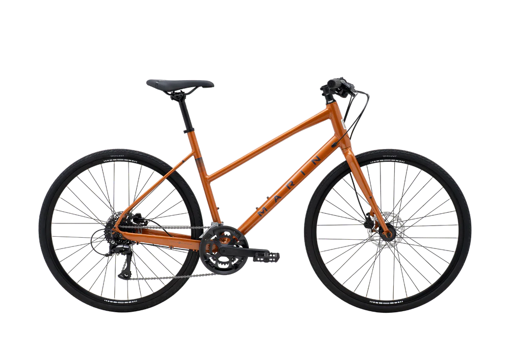 The Fairfax 2 is the top-end step through model bike in the collection, with plenty of upgrades over the base model. It’s built around a fast and light Series 2 aluminum frame and aluminum straight-blade fork and comes with a Shimano 2x 8-speed Shimano drivetrain, Tektro hydraulic disc brakes, Vee Tire Co tires and plenty of reliable Marin components.
