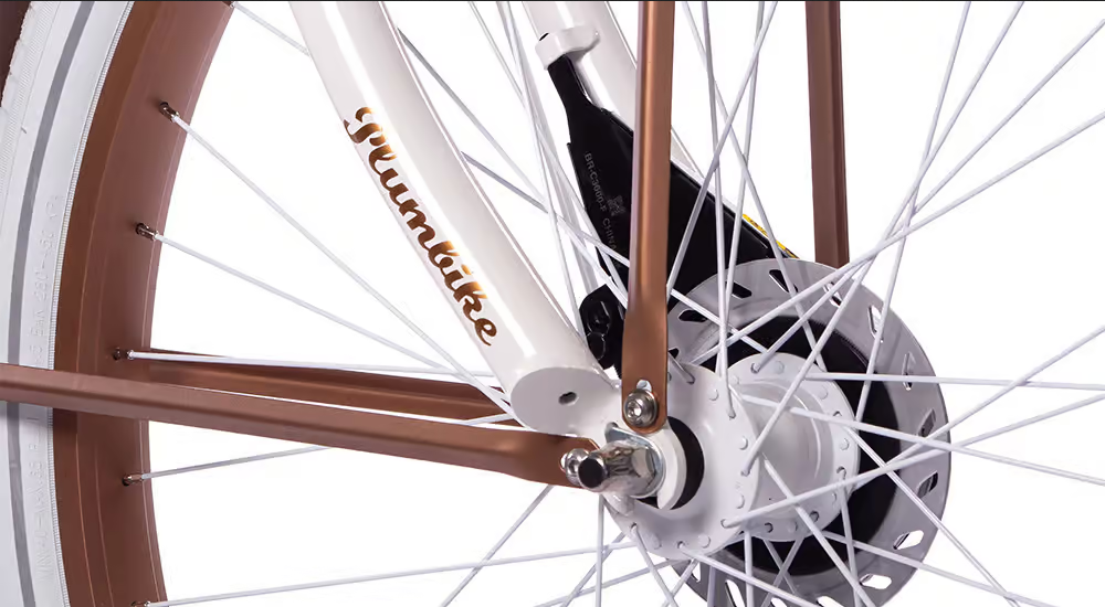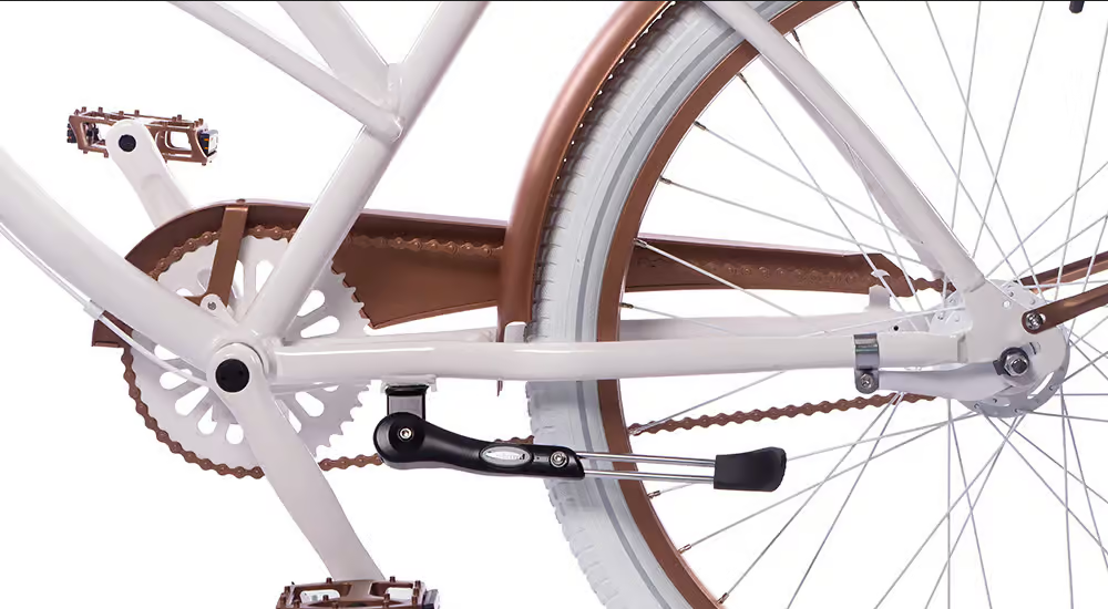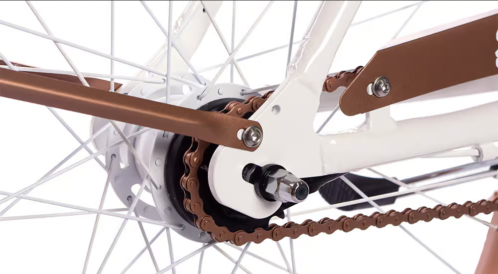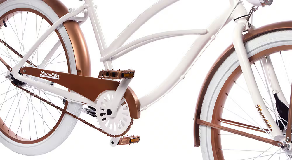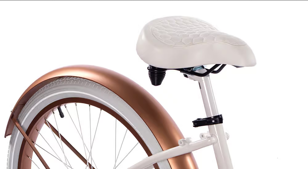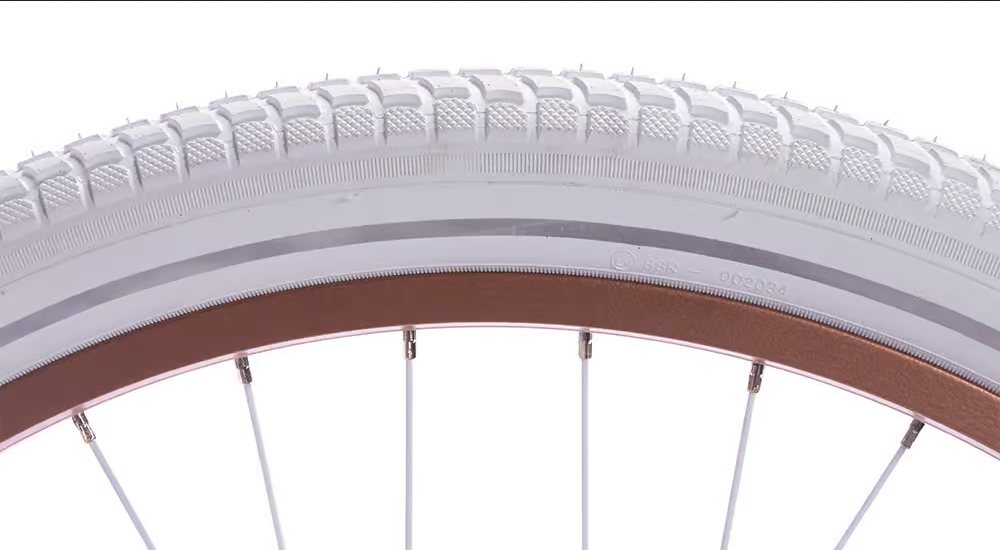 Biały, miedziany. Opony w kolorze białym, chwyty i siodło w kolorze białym.