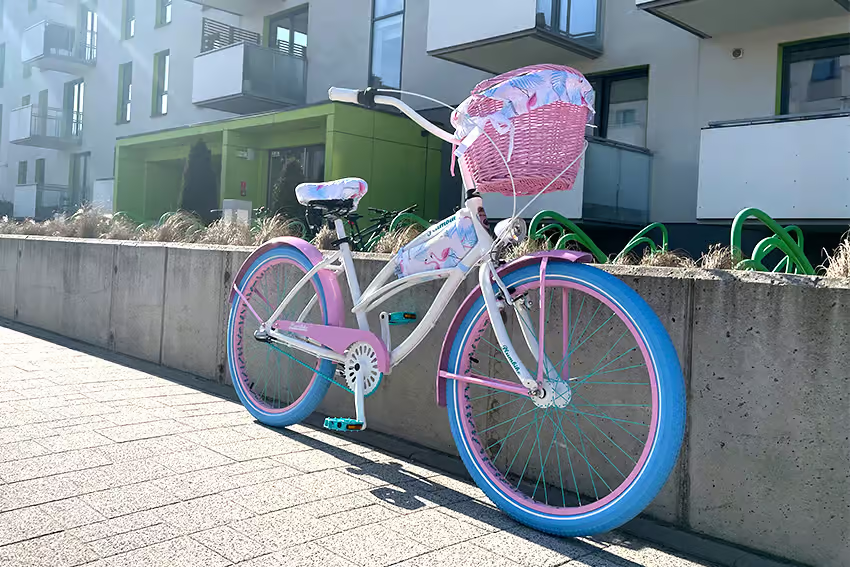 Biały, pudrowy róż, turkusowy. Opony w kolorze niebieskim, chwyty i siodło w kolorze białym.