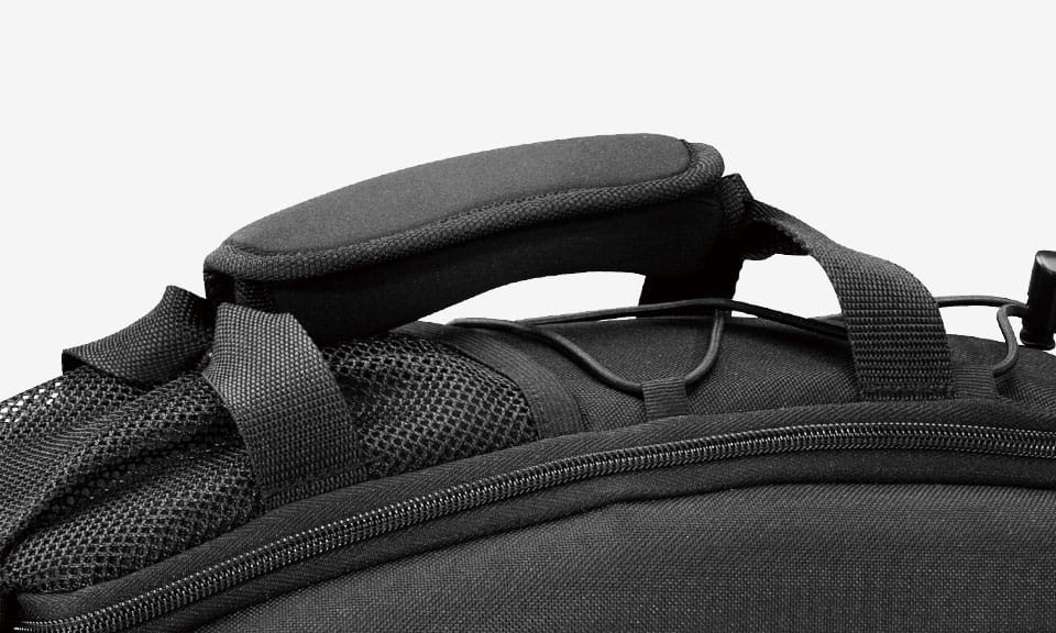 Dwa formowane boczne panele połączone z elastycznym materiałem 600 denier, tworzą półsztywną, odporną na warunki atmosferyczne torbę. Wyposażona w dzieloną komorę główną, siateczkowe boczne kieszenie oraz uchwytu na butelkę wody. Mocowana za pomocą zintegrowanych pasków.