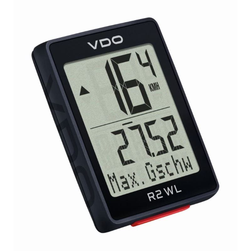 Dzięki bezprzewodowemu komputerowi rowerowemu z serii VDO R, rowerzyści w drodze do biura, na rundzie treningowej lub na weekendowej wycieczce zawsze mają dziesięć najważniejszych funkcji rowerowych na oku. Wodoodporny komputer rowerowy wskazuje , dystans, czas jazdy, czas, całkowity jazdy, średnią prędkość i aktualną temperaturę. Specjalne funkcje tego komputera to również porównanie średniej prędkości z prędkością aktualną i maksymalna prędkość. W ten sposób rowerzyści są zmotywowani do szybszej jazdy i bicia własnych rekordów prędkości. Ustawienia i obsługę VDO R2 WL w prosty sposób dokonujemy ergonomicznym czerwonym przyciskiem. Dzięki zdefiniowanym rozmiarom opon zaprogramowanie obwodu opony jest dziecinnie proste. Podstawkę wodoodpornego komputera rowerowego bardzo szybko montujemy na kierownicy lub jej wsporniku, zawartymi w zestawie opaskami kablowymi. Komputer rowerowy można następnie łatwo wyjąć z uchwytu i schować do kieszeni, a tym samym chronić przed kradzieżą. Nadajnik radiowy przymocowany do widelca przesyła prędkość zmierzoną na kole do VDO R2 WL a zintegrowana wymienna bateria (CR 2032) jest wystarczająca na ponad dwa lata użytkowania.